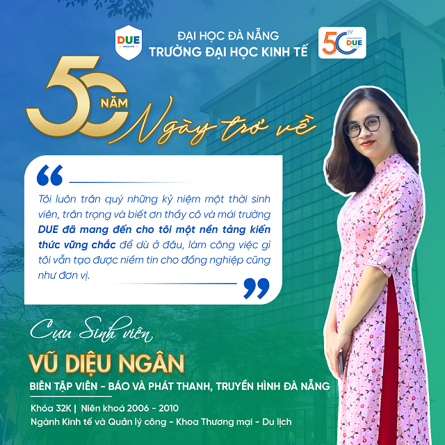 “Thoáng chốc đã 15 năm kể từ ngày tôi rời xa mái Trường Đại học Kinh tế - Đại học Đà Nẵng. DUE nay đã tròn 50 năm, mang hơi thở hiện đại, trẻ trung và năng động của thời đại mới. Ngắm nhìn ngôi trường khang trang đầy màu sắc, giảng đường và Thư viện tiện nghi, không gian rực rỡ sắc màu, lòng tôi bồi hồi nhớ về thời sinh viên giản dị. Những ngày xếp hàng mượn giáo trình, những buổi học nhóm, những câu chuyện rì rầm không dứt… Tất cả giờ đã thành ký ức đẹp đẽ của một thời thanh xuân.