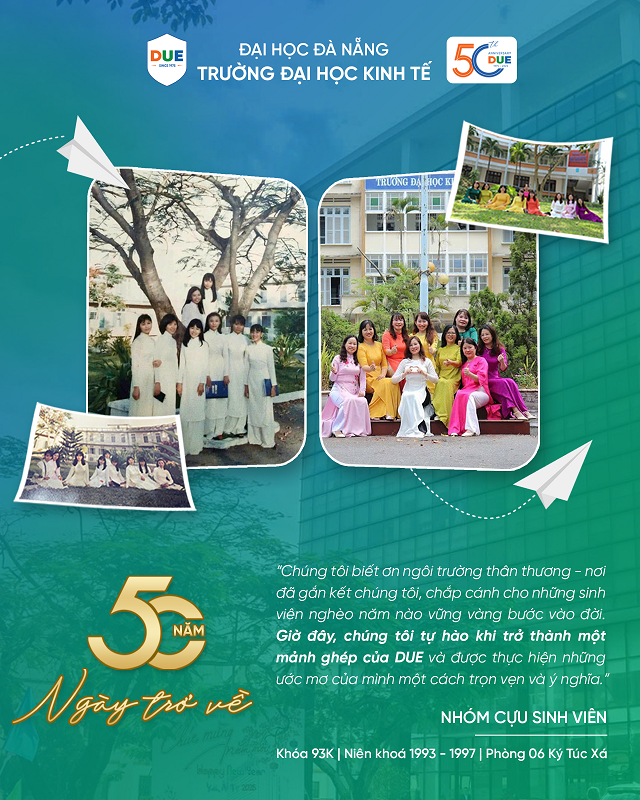 Ba thập kỷ đã trôi qua, cuộc sống đổi thay muôn hình vạn trạng. Tà áo trắng ngây thơ thuở ấy nay đã được thay bằng những sắc áo của sự trưởng thành, tự tin và rạng rỡ. Nhưng trong sâu thẳm mỗi người, tình bạn, ký ức về quãng đời sinh viên và tình yêu với mái trường DUE vẫn vẹn nguyên như ngày đầu. Chúng tôi biết ơn ngôi trường thân thương - nơi đã gắn kết chúng tôi, chắp cánh cho những sinh viên nghèo năm nào vững vàng bước vào đời. Giờ đây, chúng tôi tự hào khi trở thành một mảnh ghép của DUE và được thực hiện những ước mơ của mình một cách trọn vẹn và ý nghĩa.