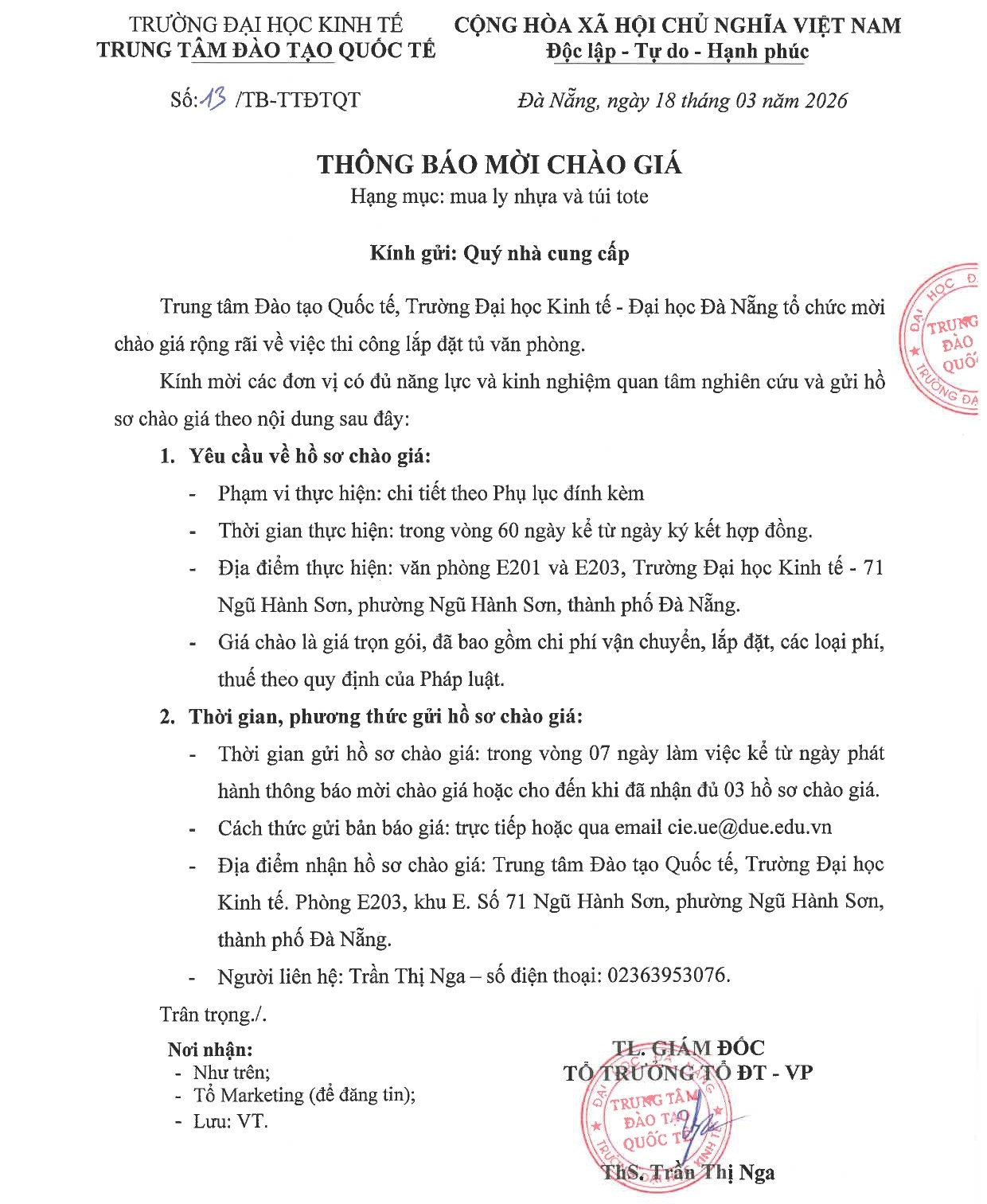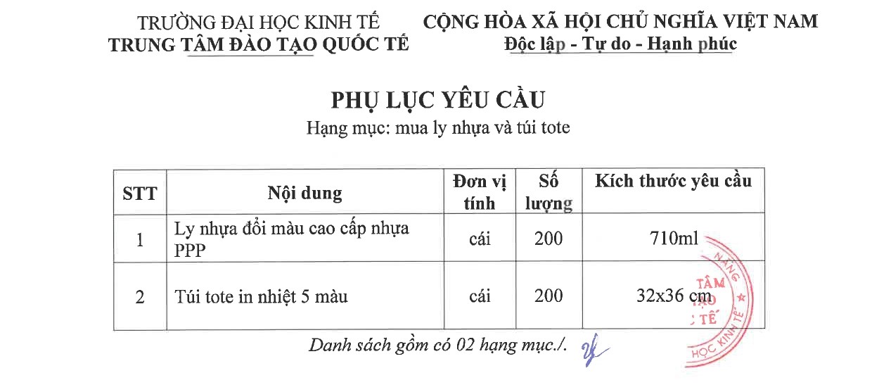 Thông báo mời chào giá Hạn mục: mua ly nhựa và túi tote