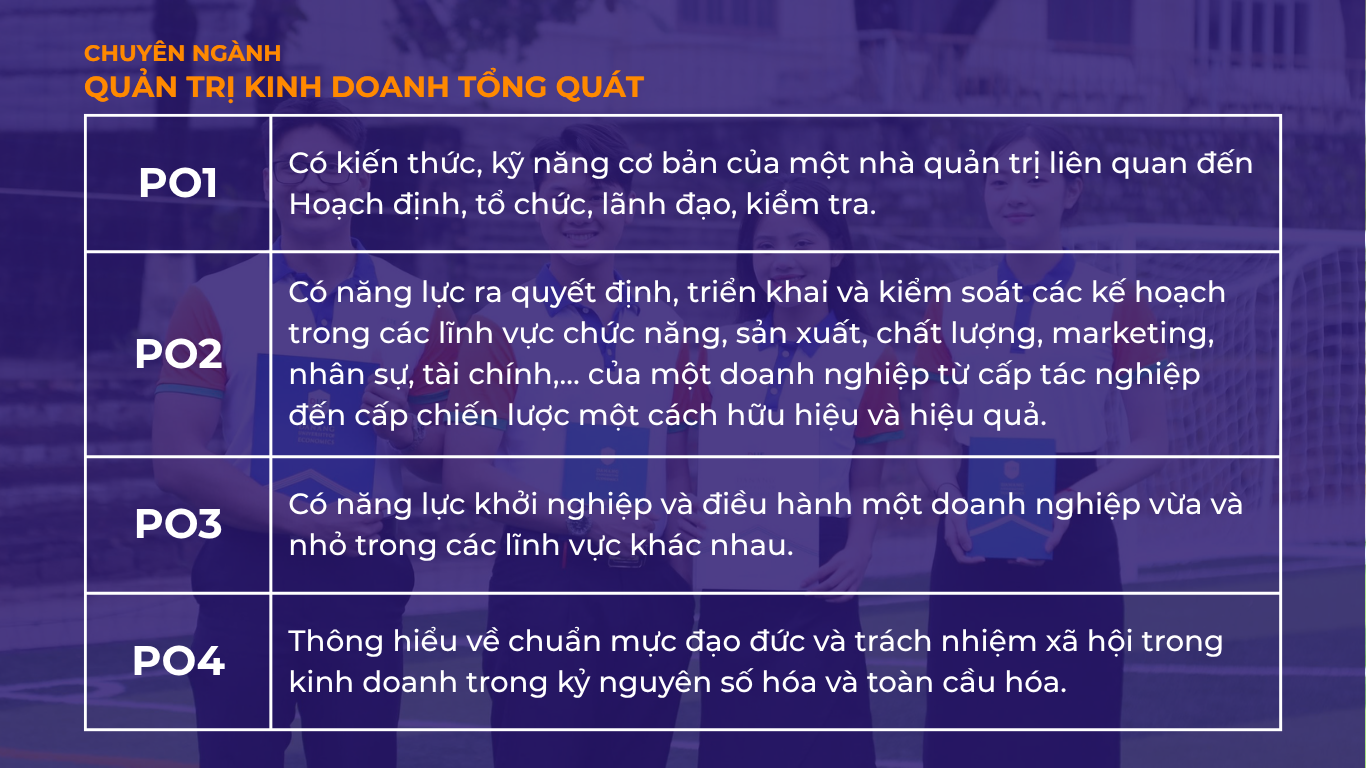 Chương trình đào tạo chuyên ngành Quản trị Kinh doanh Tổng quát (Hệ Tiếng Anh) được thiết kế nhằm trang bị cho sinh viên nền tảng kiến thức vững chắc và kỹ năng quản trị hiện đại trong môi trường toàn cầu. Với sự kết hợp giữa lý thuyết chuyên sâu và ngôn ngữ quốc tế, chương trình tập trung vào các giá trị cốt lõi: năng lực điều hành, tư duy chiến lược,..