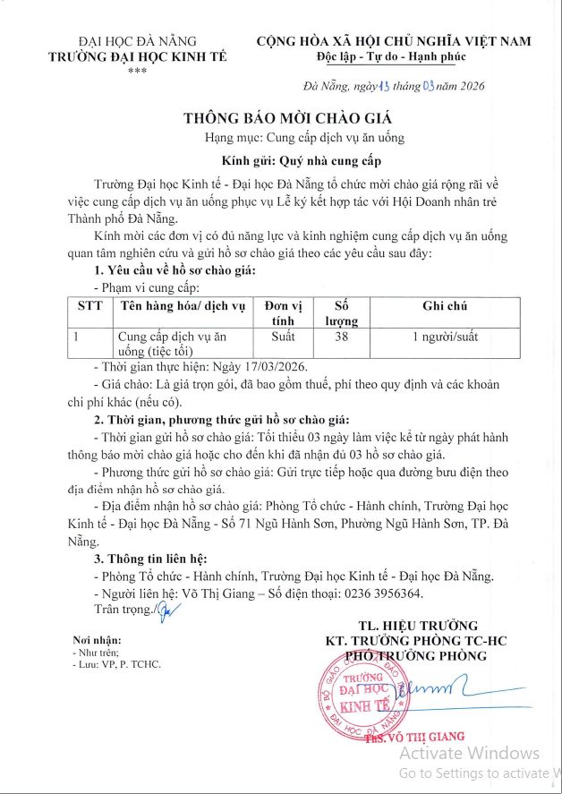 Thông báo mời chào giá: Cung cấp dịch vụ ăn uống
