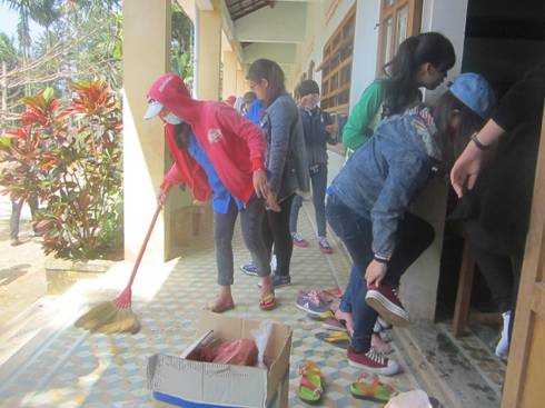 Các bạn còn lại, nam thì vận chuyển đồ đạc, dụng cụ vào trường, nữ thì hoặc phụ hậu cần hoặc dọn dẹp phòng ốc. Phải dành lời khen tặng cho hậu cần của đoàn “Hơi ấm vùng cao”: món ăn trưa Mì quảng gà vô cùng ngon, nhanh, giúp mọi người nhanh chóng lấy lại sức sau chuyến đi dài.