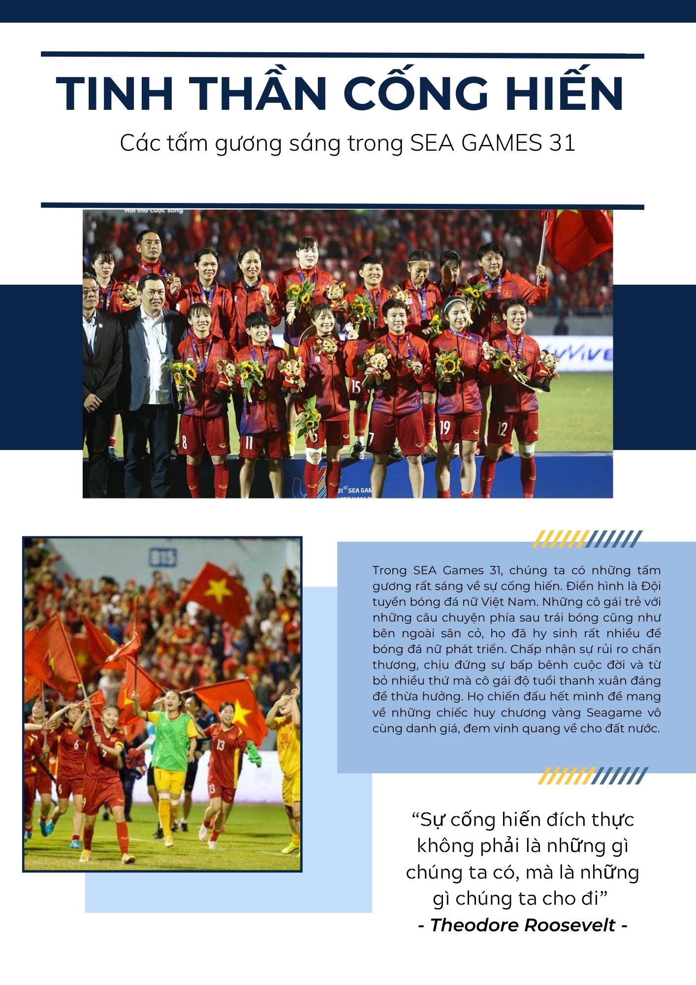 Trong SEA Games 31, chúng ta có những tấm gương rất sáng về sự cống hiến điển hình là Đội tuyển bóng đá nữ Việt Nam. Đằng sau chặng hành trình chinh phục tấm huy chương cao quý, để đổi lấy khoảnh khắc đầy tự hào khi hát vang Quốc ca Việt Nam với lá cờ trước ngực chính là hy sinh và cống hiến. Những cô gái trẻ với những câu chuyện phía sau trái bóng cũng như bên ngoài sân cỏ, họ đã hy sinh rất nhiều để bóng đá nữ phát triển. Sau mỗi trận đấu, họ chấp nhận sự rủi ro chấn thương, đánh đổi bởi mồ hôi nước mắt, thậm chí là máu và tuổi thanh xuân của chính mình. Họ chiến đấu hết mình để mang về những chiếc huy chương vàng SEA Games vô cùng danh giá, đem vinh quang về cho đất nước. Đó chính là câu chuyện về những “cô gái vàng” - tấm gương tuyệt vời về ý chí, nghị lực phi thường, khổ luyện và vượt lên trên hoàn cảnh để cống hiến thành tích cho thể thao nước nhà.