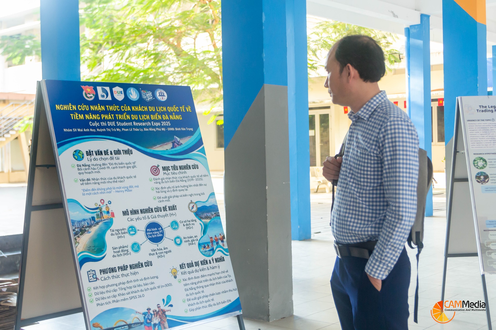 Trước thềm Vòng Chung kết đang đến rất gần, Sảnh A Trường Đại học Kinh tế - ĐHĐN dường như đang nóng lên từng giờ với không gian triển lãm của Cuộc thi trưng bày triển lãm ý tưởng nghiên cứu khoa học - DUE Student Research Expo 2025. Nơi đây càng trở nên đặc biệt hơn với sự góp mặt của 15 ý tưởng xuất sắc đã vượt qua Vòng Sơ loại, đại diện cho tư duy sắc bén và bản lĩnh sáng tạo của các đội thi.