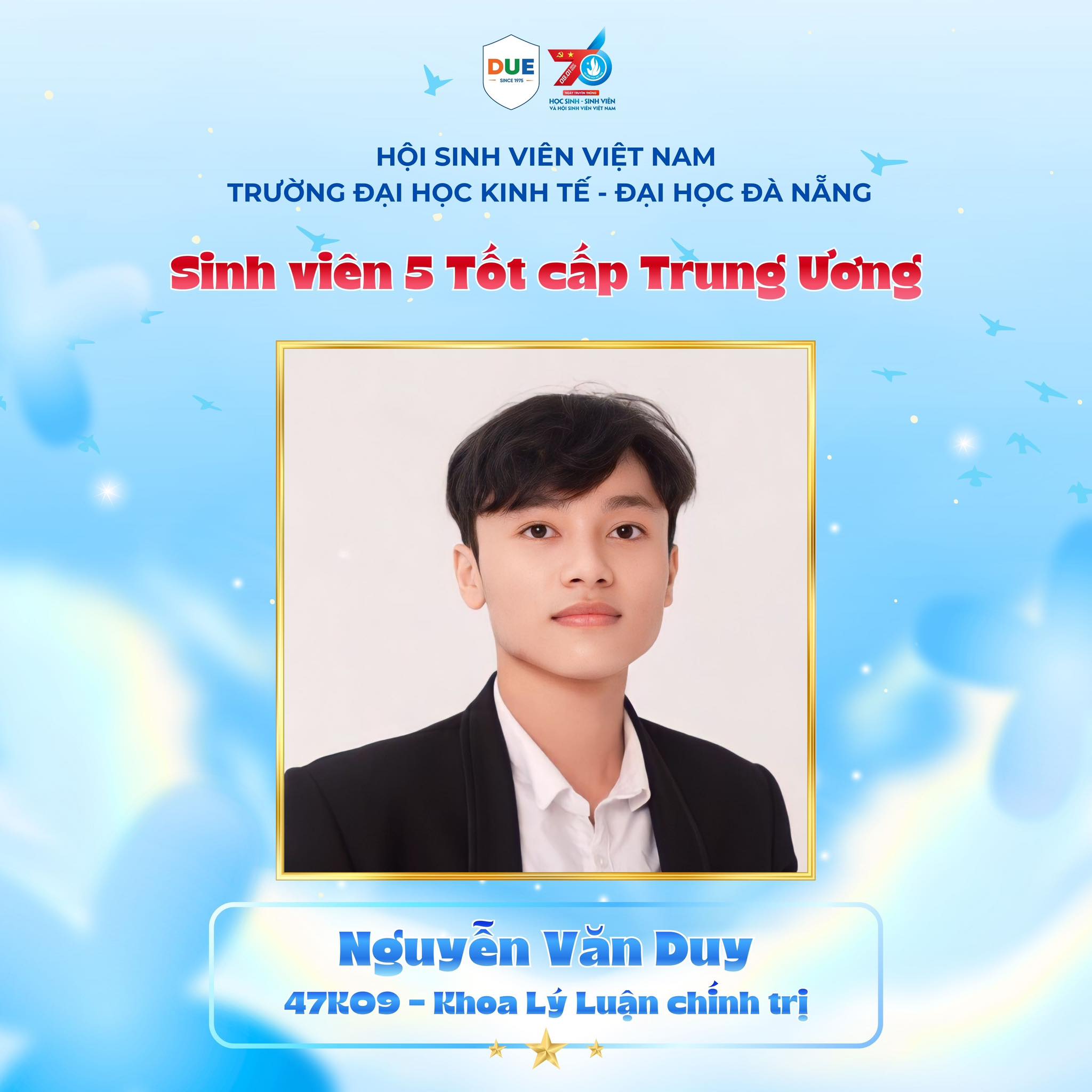 Danh hiệu “Sinh viên 5 tốt” cấp Trung ương không chỉ là phần thưởng xứng đáng cho những nỗ lực đã qua, mà còn là động lực để đồng chí Nguyễn Văn Duy tiếp tục viết tiếp hành trình tuổi trẻ bằng khát vọng cống hiến, tinh thần tiên phong và trách nhiệm với cộng đồng. Chúc đồng chí sẽ luôn giữ vững ngọn lửa nhiệt huyết, tiếp tục tỏa sáng và lan truyền những giá trị tốt đẹp đến sinh viên Trường Đại học Kinh tế - Đại học Đà Nẵng.
