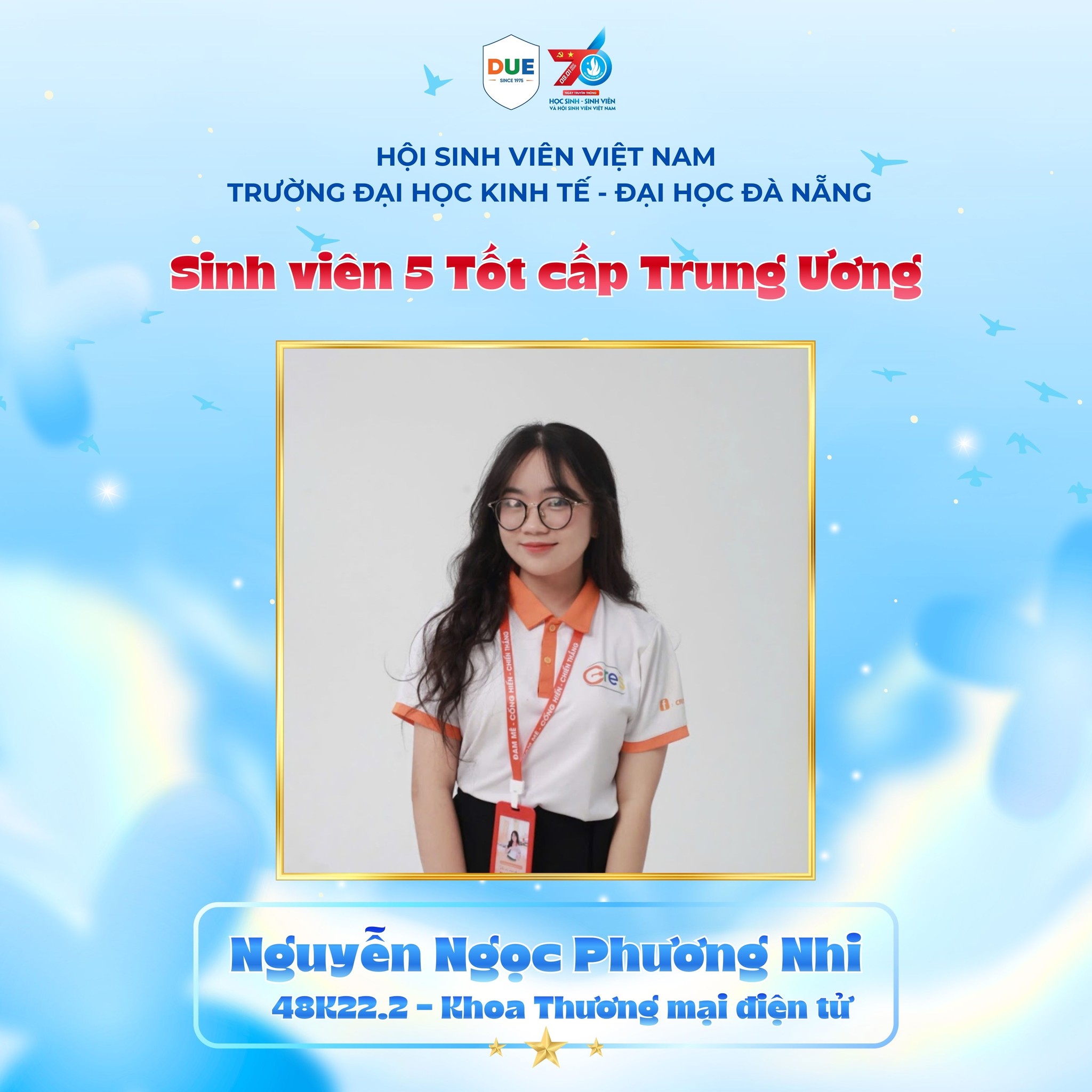 26/12/2025Đoàn Thanh niên - Hội Sinh viên Trường Đại học Kinh tế - Đại học Đà Nẵng xin trân trọng tuyên dương đồng chí Nguyễn Ngọc Phương Nhi đã vinh dự đạt danh hiệu “Sinh viên 5 tốt” cấp Trung ương năm học 2024 - 2025. Đây là một gương mặt gây ấn tượng với hình ảnh năng động, tự tin và đầy nhiệt huyết, đồng thời là tấm gương sáng với thành tích học tập nổi bật cùng sự tích cực trong các hoạt động phong trào.