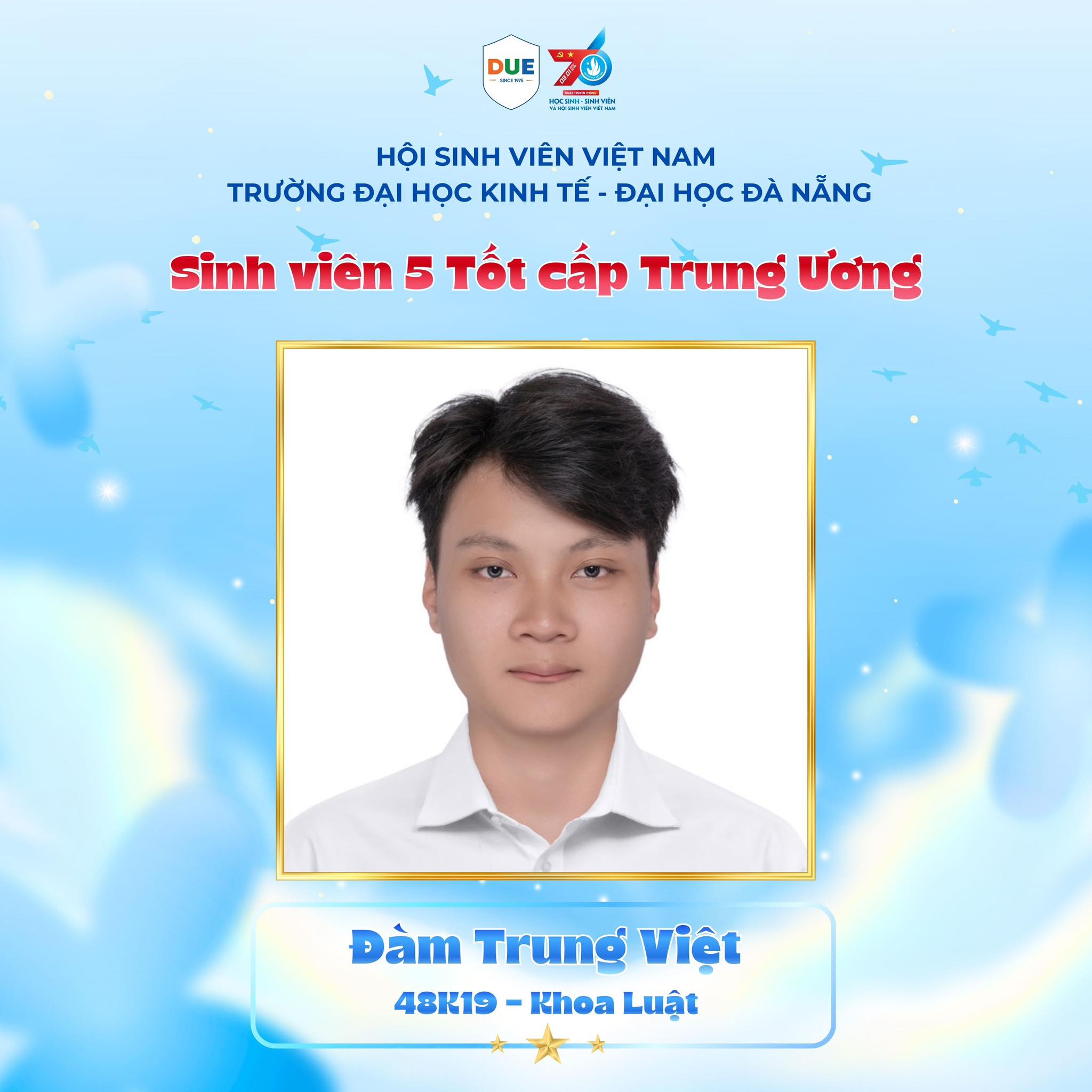 Danh hiệu “Sinh viên 5 tốt” cấp Trung ương là sự ghi nhận xứng đáng cho những nỗ lực bền bỉ của đồng chí Đàm Trung Việt, đồng thời là động lực để bạn tiếp tục phát triển, chinh phục những mục tiêu mới trong tương lai. Chúc bạn sẽ luôn giữ vững tinh thần tiên phong, không ngừng hoàn thiện bản thân và tiếp tục lan tỏa những giá trị tích cực đến cộng đồng sinh viên.