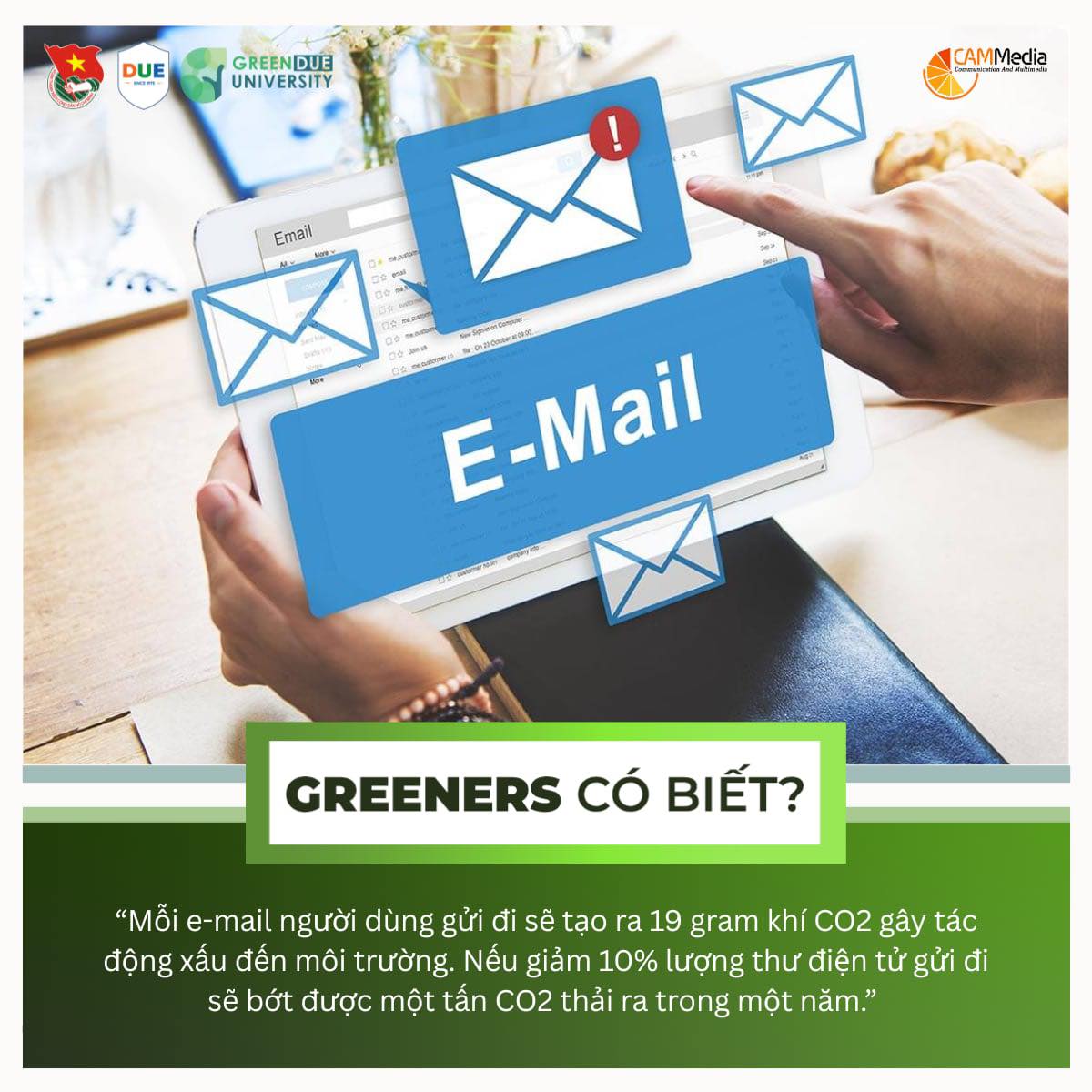 Không chỉ đơn thuần là thao tác gửi - nhận, email còn tiêu thụ năng lượng tại các máy chủ, thiết bị và hệ thống mạng truyền tải, trong đó phần lớn điện năng đến từ nhiên liệu hóa thạch. Đặc biệt, những email chứa tệp đính kèm dung lượng lớn sẽ kéo theo mức tiêu thụ năng lượng và phát thải CO2 cao hơn. Chính vì vậy, chỉ cần giảm 10% số thư điện tử gửi đi trong một năm, chúng ta có thể giảm được khoảng một tấn CO2 thải ra môi trường đấy! Đây là một bước nhỏ nhưng có ý nghĩa lớn nếu mỗi người chúng ta cùng chung tay thực hiện.