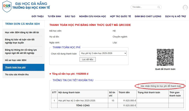 Tại bảng Thông tin chi tiết khoản thu, học viên bấm Xác nhận thông tin học phí để thanh toán, mã QR sẽ được tạo ra tương ứng với số tiền học phí học viên phải nộp. Học viên sử dụng ứng dụng của ngân hàng bất kỳ để quét mã QR thực hiện thanh toán.