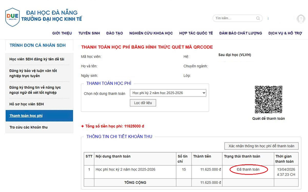 => Chọn nội dung thanh toán là Học phí học kỳ 2 năm học 2025-2026