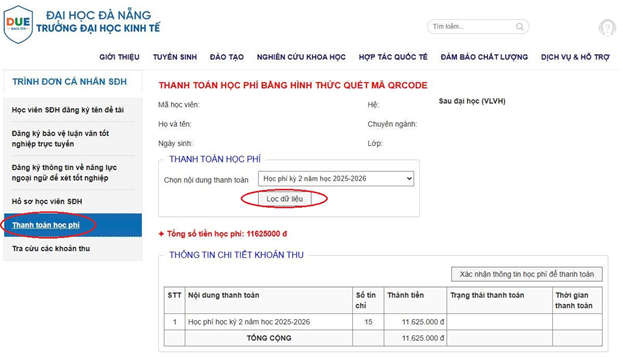 => Bấm Lọc dữ liệu để hiển thị thông tin học phí